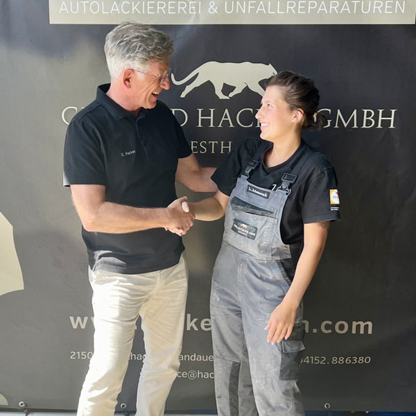 Das ganze Team sagt “Herzlichen Glückwunsch”! Ab sofort arbeitet sie eigenverantwortlich in unserer Lackierabteilung und erhält die weibliche Note im “Team Lack”.